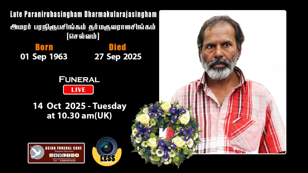 Descriptions: Funeral Service Live Late Paranirubasingham Dharmakularajasingham 14 Sep 2025 – Tuesday at 10.30 am (UK Time)